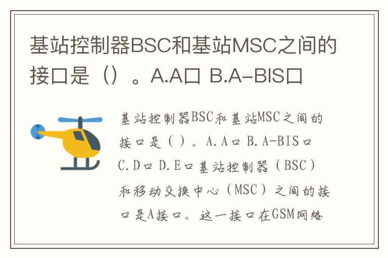 基站控制器BSC和基站MSC之间的接口是()。A.A口 B.A-BIS口 C.D口 D.E口