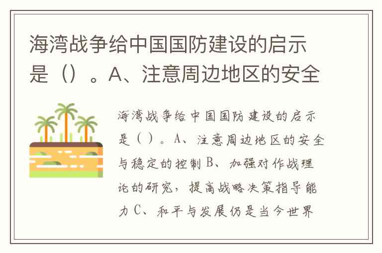 海湾战争给中国国防建设的启示是()。A、注意周边地区的安全与稳定的控制 B、加强对作战理论的研究,提高战略决策指导能力 C、和平与发展仍是当今世界两大主题,但是过程曲折 D、以上都是