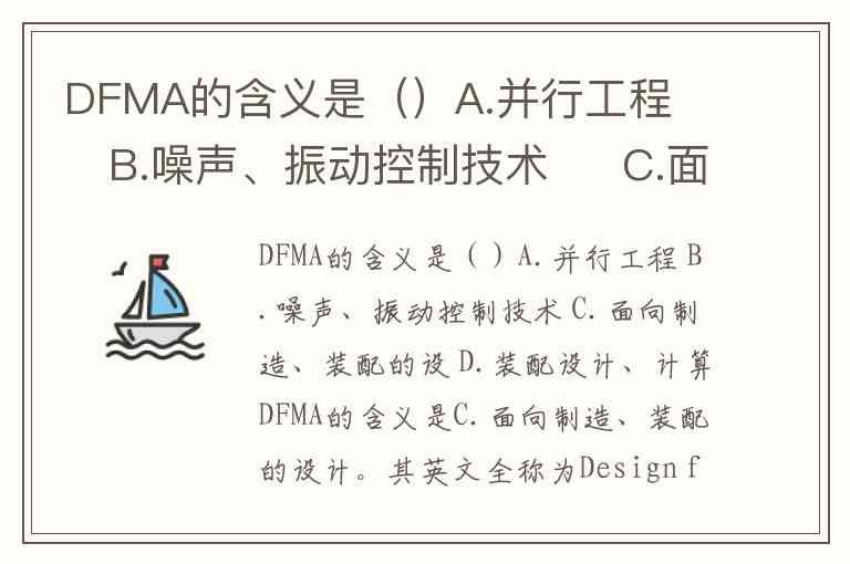 DFMA的含义是()A.并行工程 B.噪声、振动控制技术 C.面向制造、装配的设 D.装配设计、计算