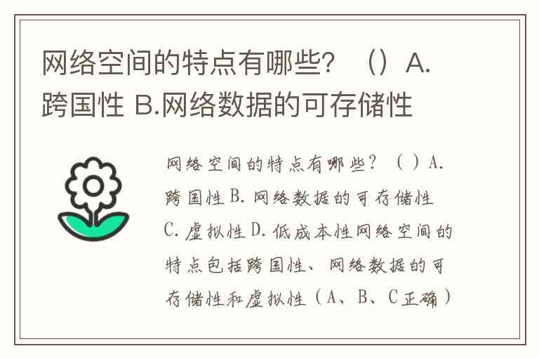 网络空间的特点包括跨国性、网络数据的可存储性和虚拟性(A、B、C正确),而低成本性并非其本质特征。