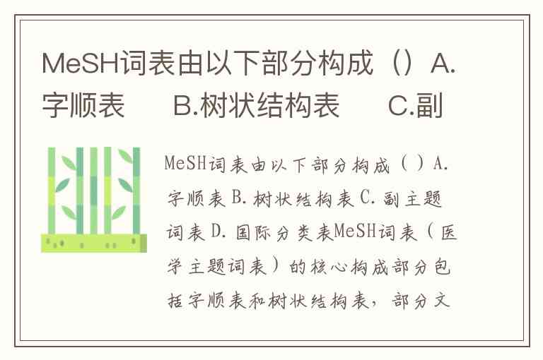 MeSH词表(医学主题词表)的核心构成部分包括字顺表和树状结构表,部分文献显示其还包含副主题词表,而“国际分类表”并非其组成部分。
