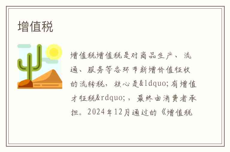 增值税是对商品生产、流通、服务等各环节新增价值征收的流转税,核心是“有增值才征税”,最终由消费者承担。2024年12月通过的《增值税法》将这一税种正式纳入法律框架,确立了“应税交易”为核心的征税原则,并简化了征管规则。