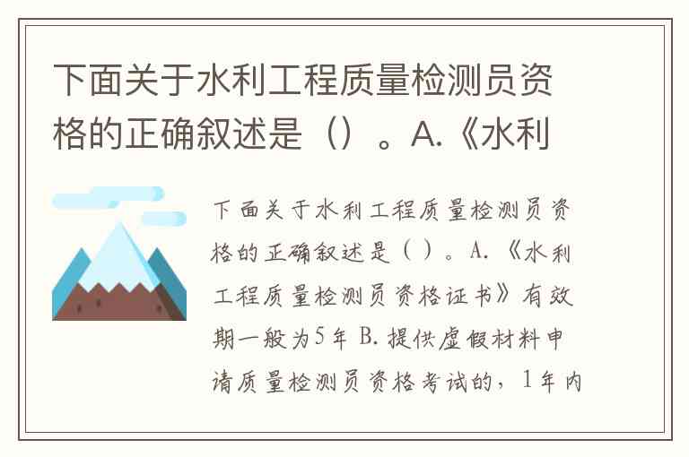 根据2024年实施的《水利工程质量检测员资格规定》及配套文件,题目中正确的选项为B。以下是具体分析: