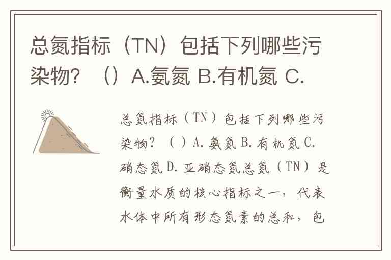 总氮指标(TN)包括下列哪些污染物?()A.氨氮 B.有机氮 C.硝态氮 D.亚硝态氮