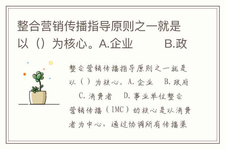 整合营销传播指导原则之一就是以()为核心。A.企业 B.政府 C.消费者 D.事业单位