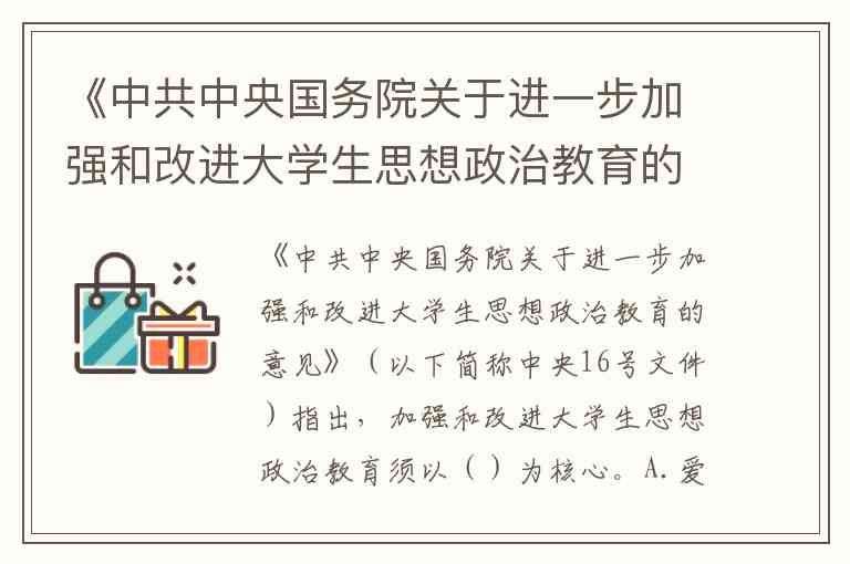 《中共中央国务院关于进一步加强和改进大学生思想政治教育的意见》明确指出,加强和改进大学生思想政治教育的指导思想是以理想信念教育为核心,以爱国主义教育为重点,以思想道德建设为基础,以大学生全面发展为目标。这一表述在文件"主要任务"部分再次强调:"以理想信念教育为核心,深入进行树立正确的世界观、人生观和价值观教育",要求通过马克思主义理论武装、党史国情教育等,引导大学生确立中国特色社会主义共同理想和共产主义远大理想。