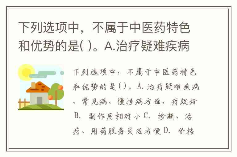 下列选项中,不属于中医药特色和优势的是( )。A.治疗疑难疾病、常见病、慢性病方面,疗效好 B.副作用相对小 C.诊断、治疗、用药服务灵活方便 D.价格高昂 E.易接受