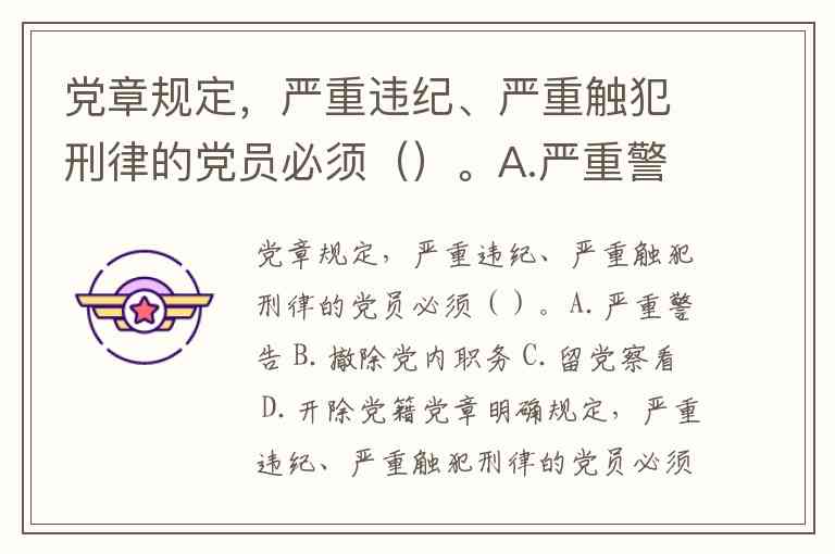 党章规定,严重违纪、严重触犯刑律的党员必须()。A.严重警告 B.撤除党内职务 C.留党察看 D.开除党籍