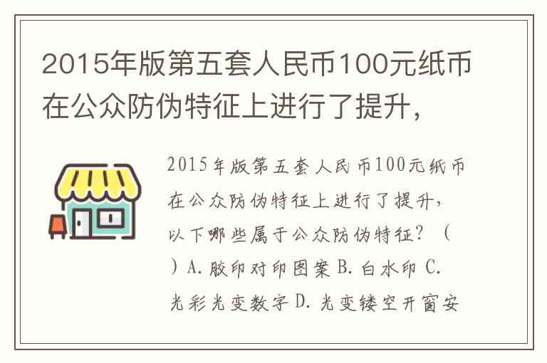 参考文档中多次提及“水印图案”或“灰水印”(如毛泽东头像水印),但白水印(选项B)并非2015年版100元纸币的官方表述或新增特征。该版本的水印主要指人像水印,而白水印通常指面额数字水印(如部分人民币的“100”白水印),但在提供的权威资料中未明确列为该版本的公众防伪特征,故不选B。