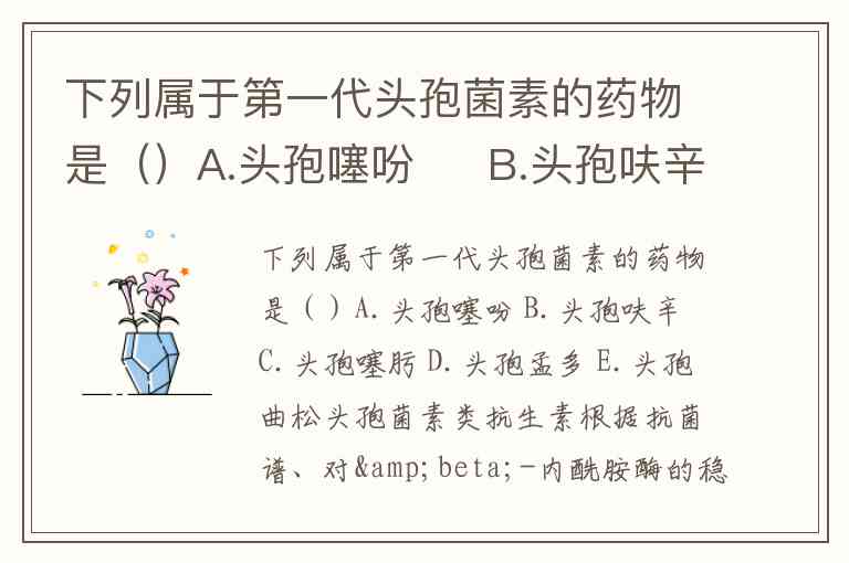 下列属于第一代头孢菌素的药物是()A.头孢噻吩 B.头孢呋辛 C.头孢噻肟 D.头孢孟多 E.头孢曲松