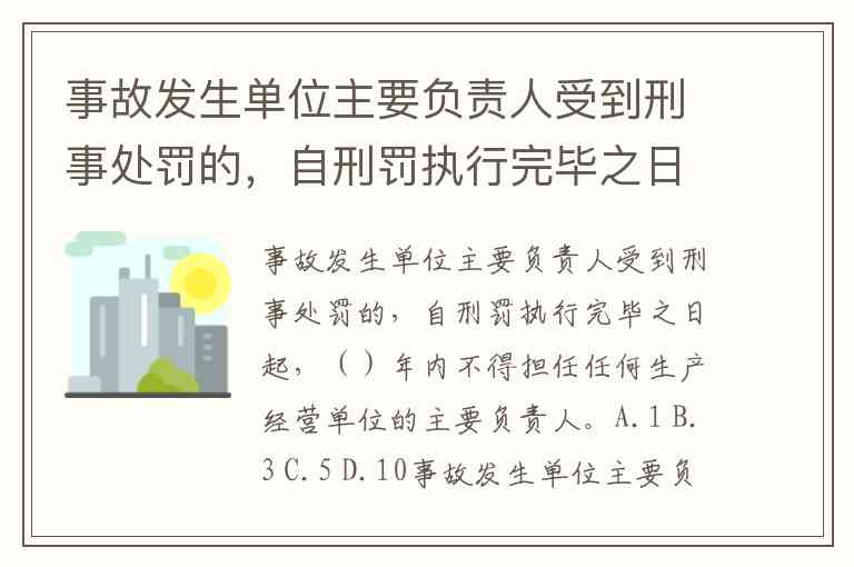 事故发生单位主要负责人受到刑事处罚的,自刑罚执行完毕之日起,()年内不得担任任何生产经营单位的主要负责人。A.1 B.3 C.5 D.10