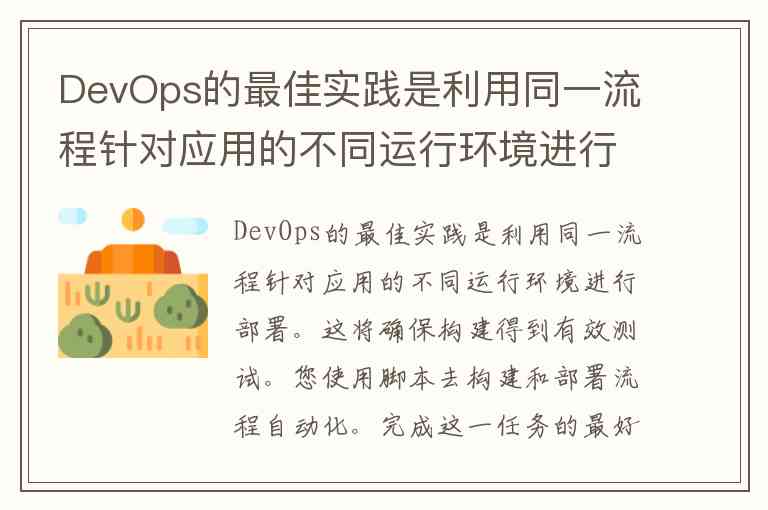 DevOps的最佳实践是利用同一流程针对应用的不同运行环境进行部署。这将确保构建得到有效测试。您使用脚本去构建和部署流程自动化。完成这一任务的最好方法是什么?()A.每种环境采用一个脚本,并将其作为版本控制系统的一部分加以维护 B.不同环境使用不同的特定脚本,以解决环境之间的差异问题 C.不同环境采用同样的脚本,对特定的配置采用手动参数 D.采用同一脚本在不同环境中进行部署,并单独管理配置信息
