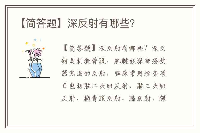深反射是刺激骨膜、肌腱经深部感受器完成的反射,临床常用检查项目包括肱二头肌反射、肱三头肌反射、桡骨膜反射、膝反射、踝反射,部分分类系统也将霍夫曼氏征和阵挛纳入其中。这些反射的神经支配和检查方法具有显著特异性,其异常(亢进、减弱或消失)可提示相应脊髓节段或神经通路病变。