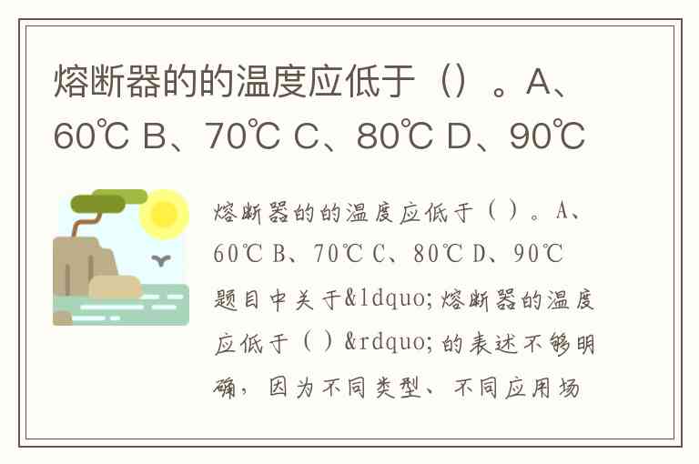 题目中关于“熔断器的温度应低于()”的表述不够明确,因为不同类型、不同应用场景的熔断器,其温度限制标准存在显著差异,且需区分“工作环境温度”“温升”“熔体最高允许温度”等不同概念。以下结合技术标准和实际应用场景分析: