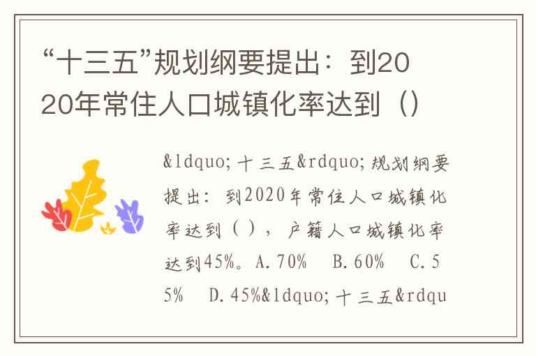 “十三五”规划纲要提出:到2020年常住人口城镇化率达到(),户籍人口城镇化率达到45%。A.70% B.60% C.55% D.45%