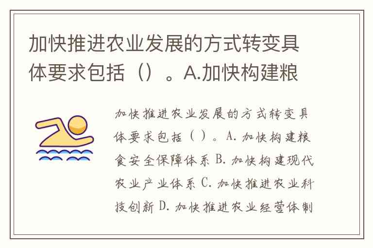 加快推进农业发展的方式转变具体要求包括()。A.加快构建粮食安全保障体系 B.加快构建现代农业产业体系 C.加快推进农业科技创新 D.加快推进农业经营体制机制创新