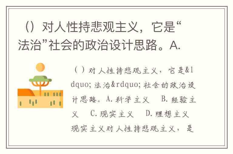 ()对人性持悲观主义,它是“法治”社会的政治设计思路。A.科学主义 B.经验主义 C.现实主义 D.理想主义
