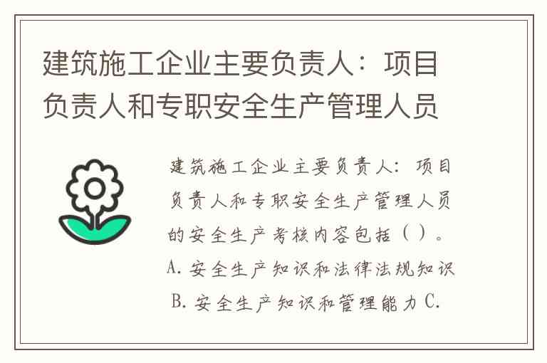 建筑施工企业主要负责人:项目负责人和专职安全生产管理人员的安全生产考核内容包括()。A.安全生产知识和法律法规知识 B.安全生产知识和管理能力 C.法律法规知识和管理能力 D.安全生产知识和安全生产业绩