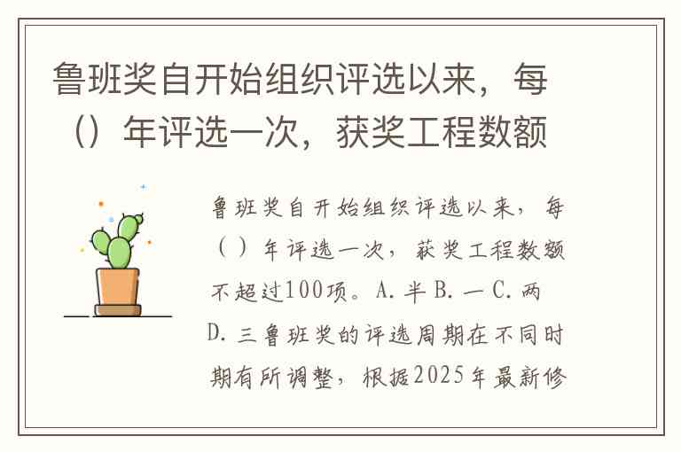 鲁班奖自开始组织评选以来,每()年评选一次,获奖工程数额不超过100项。A.半 B.一 C.两 D.三