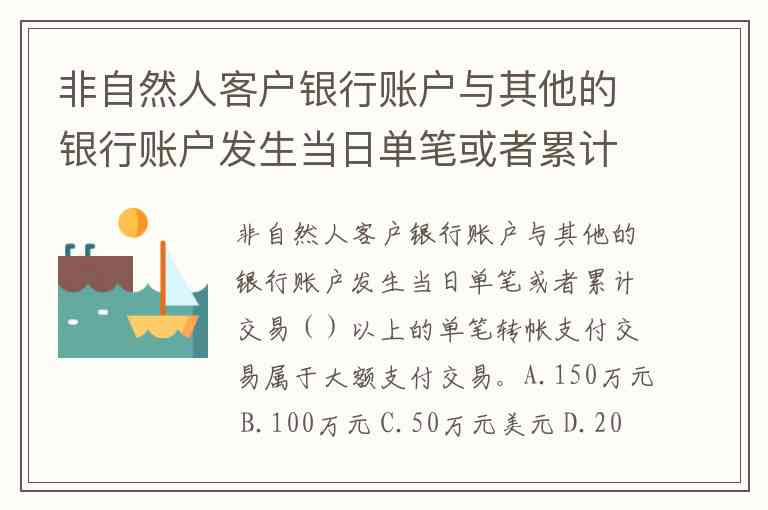 非自然人客户银行账户与其他的银行账户发生当日单笔或者累计交易()以上的单笔转帐支付交易属于大额支付交易。A.150万元 B.100万元 C.50万元美元 D.20万元美元