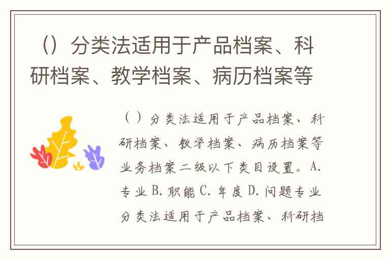 ()分类法适用于产品档案、科研档案、教学档案、病历档案等业务档案二级以下类目设置。A.专业 B.职能 C.年度 D.问题