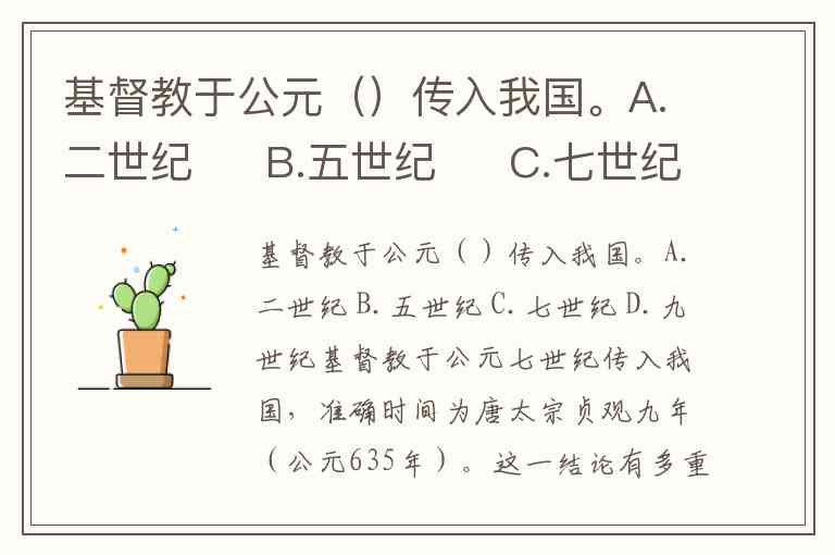 基督教于公元()传入我国。A.二世纪 B.五世纪 C.七世纪 D.九世纪