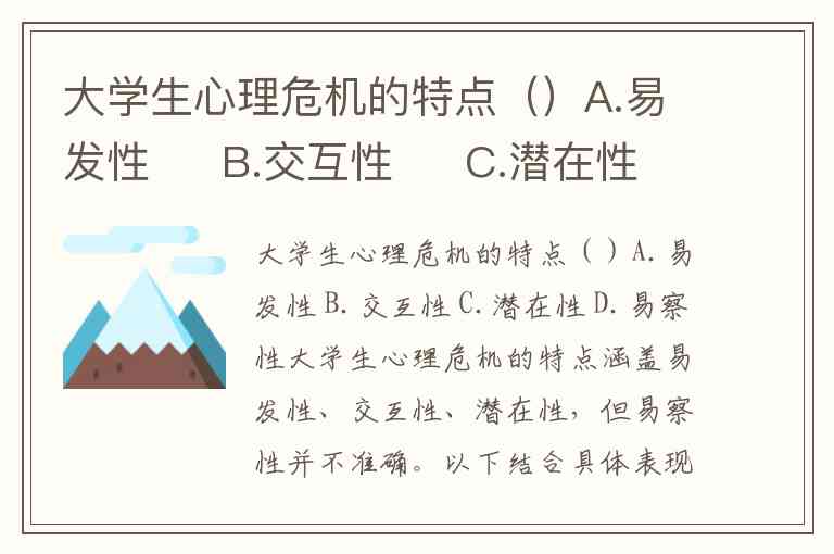 大学生心理危机的特点涵盖易发性、交互性、潜在性,但易察性并不准确。以下结合具体表现与研究依据展开分析: