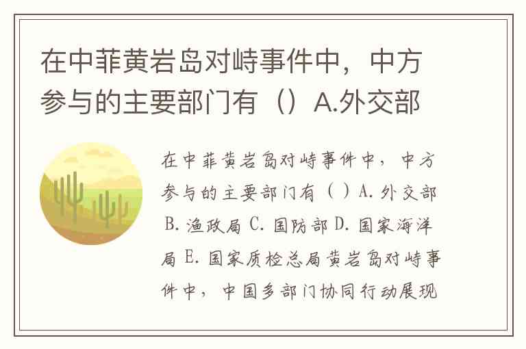 在中菲黄岩岛对峙事件中,中方参与的主要部门有()A.外交部 B.渔政局 C.国防部 D.国家海洋局 E.国家质检总局