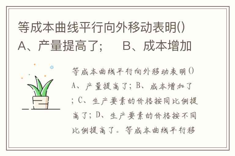等成本曲线平行向外移动表明()A、产量提高了; B、成本增加了; C、生产要素的价格按同比例提高了; D、生产要素的价格按不同比例提高了。