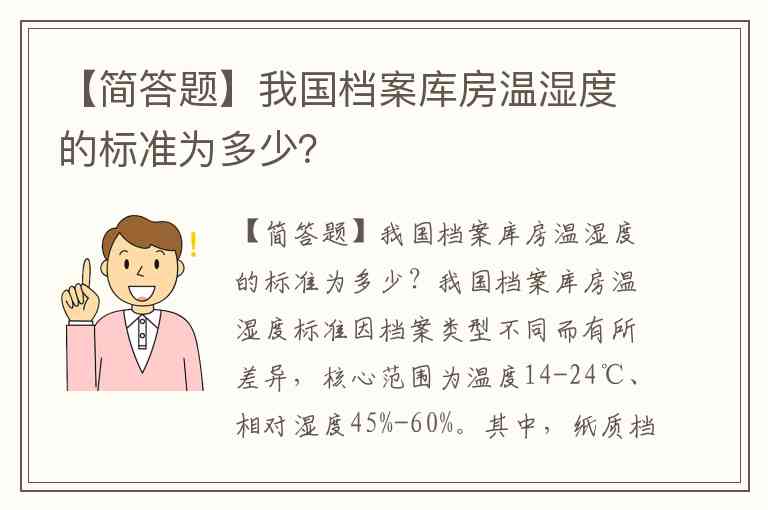 我国档案库房温湿度标准因档案类型不同而有所差异,核心范围为温度14-24℃、相对湿度45%-60%。其中,纸质档案库需维持温度1424℃、相对湿度4560%;音像磁带库湿度要求略低,为40%60%;光盘库则需更严格控制在温度1520℃、相对湿度25~45%。