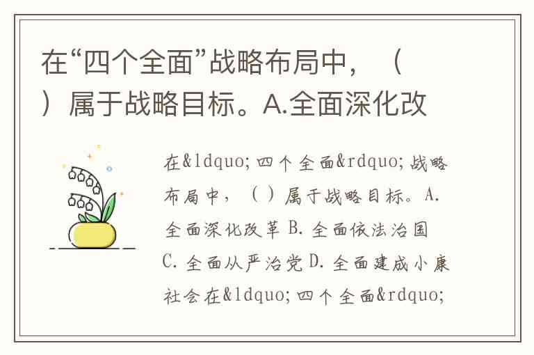 在“四个全面”战略布局中,()属于战略目标。A.全面深化改革 B.全面依法治国 C.全面从严治党 D.全面建成小康社会