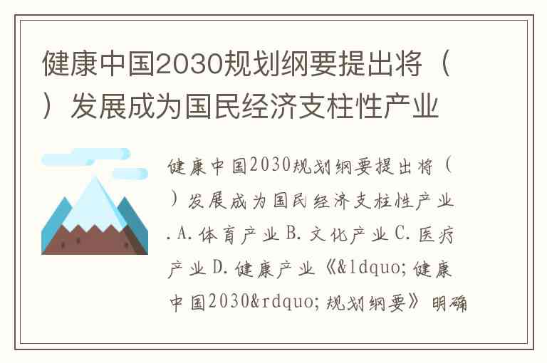 健康中国2030规划纲要提出将()发展成为国民经济支柱性产业.A.体育产业 B.文化产业 C.医疗产业 D.健康产业