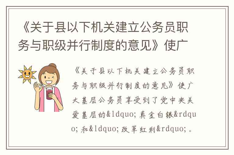 《关于县以下机关建立公务员职务与职级并行制度的意见》通过打破"职务决定待遇"的单一晋升模式,让基层公务员不必晋升领导职务也能通过职级提升获得经济待遇改善,切实体现了党中央对基层干部的关怀。该制度2015年由中共中央办公厅、国务院办公厅发布,针对县乡两级公务员晋升空间狭窄、待遇长期偏低的问题,首次在职务之外开辟职级通道,将经济待遇分配从主要由职务决定转向主要由职级决定。