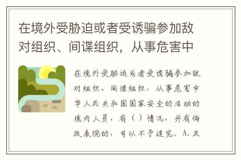 在境外受胁迫或者受诱骗参加敌对组织、间谍组织,从事危害中华人民共和国国家安全的活动的境内人员,有()情况,并有悔改表现的,可以不予追究。A.及时向中华人民共和国驻外机构如实说明。 B.入境后直接及时向国家安全机关、公安机关如实说明。 C.入境后通过所在单位及时向国家安全机关、公安机关如实说明。 D.入境后停止活动,但未向国家安全机关、公安机关如实说明。