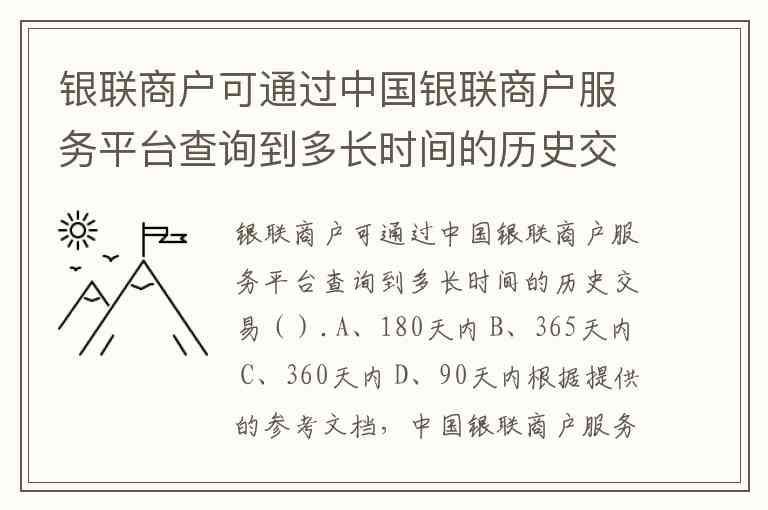 银联商户可通过中国银联商户服务平台查询到多长时间的历史交易().A、180天内 B、365天内 C、360天内 D、90天内
