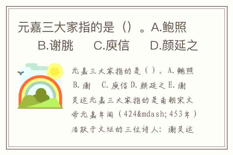 元嘉三大家指的是南朝宋文帝元嘉年间(424—453年)活跃于文坛的三位诗人:谢灵运、颜延之、鲍照,对应选项A、D、E。这一称谓源于他们共同推动了南朝诗歌注重词藻华丽、对仗工整的审美风尚,尤其擅长描绘山川景物,被合称为“宋初三体”。