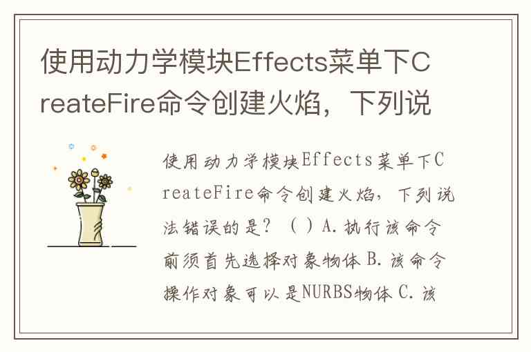 使用动力学模块Effects菜单下CreateFire命令创建火焰,下列说法错误的是?()A.执行该命令前须首先选择对象物体 B.该命令操作对象可以是NURBS物体 C.该命令操作对象可以是NURBS曲线 D.该命令操作对象可以是多边形物体