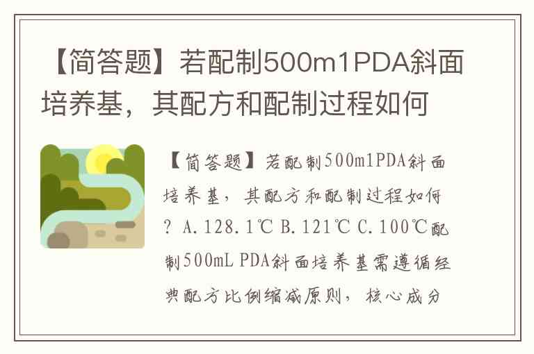 【简答题】若配制500m1PDA斜面培养基,其配方和配制过程如何?A.128.1℃ B.121℃ C.100℃