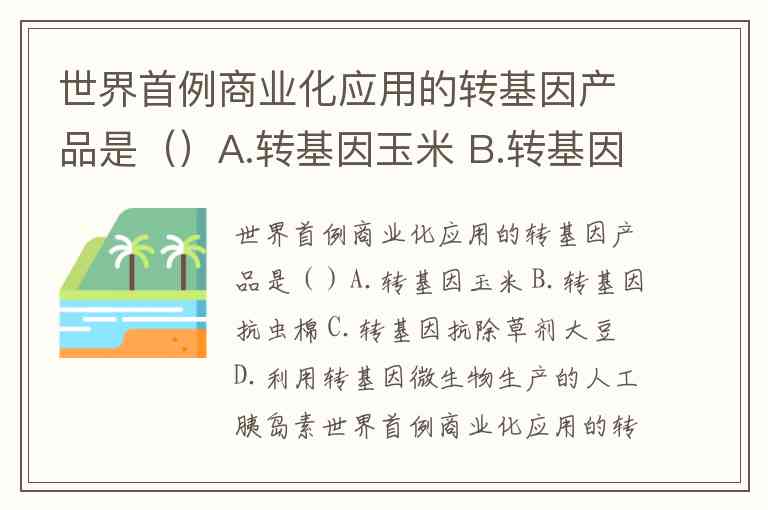 世界首例商业化应用的转基因产品是()A.转基因玉米 B.转基因抗虫棉 C.转基因抗除草剂大豆 D.利用转基因微生物生产的人工胰岛素