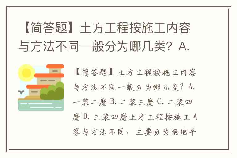 【简答题】土方工程按施工内容与方法不同一般分为哪几类?A.一浆二磨 B.二浆三磨 C.二浆四磨 D.三浆四磨