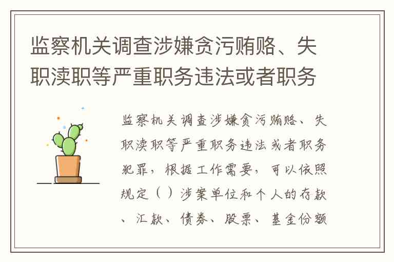 监察机关调查涉嫌贪污贿赂、失职渎职等严重职务违法或者职务犯罪,根据工作需要,可以依照规定()涉案单位和个人的存款、汇款、债券、股票、基金份额等财产。A.查封、划拨 B.冻结、扣押 C.查封、扣押 D.查询、冻结