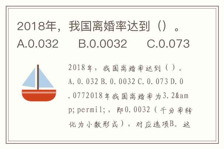 2018年我国离婚率为3.2‰,即0.0032(千分率转化为小数形式),对应选项B。这一数据来自民政部公布的统计结果,反映了当年每千人口中发生的离婚事件频率。