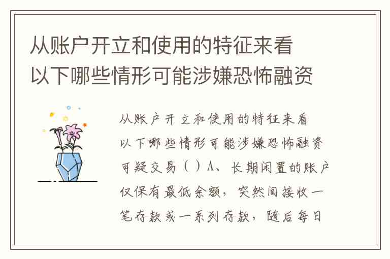 从账户开立和使用的特征来看以下哪些情形可能涉嫌恐怖融资可疑交易()A、长期闲置的账户仅保有最低余额,突然间接收一笔存款或一系列存款,随后每日提取现金存款,直到所存资金全部提取完毕 B、用新成立的法人实体名义开立账户,而存入该账户的存款金额与该实体创办者的收入相比,远超出其预期存款水平 C、同一个人开立多个账户,存入多笔小额存款,而总额同其预期收入不相符 D、开立账户的法人实体,参与一个组织或者基金会的活动