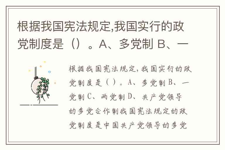 根据我国宪法规定,我国实行的政党制度是()。A、多党制 B、一党制 C、两党制 D、共产党领导的多党合作制