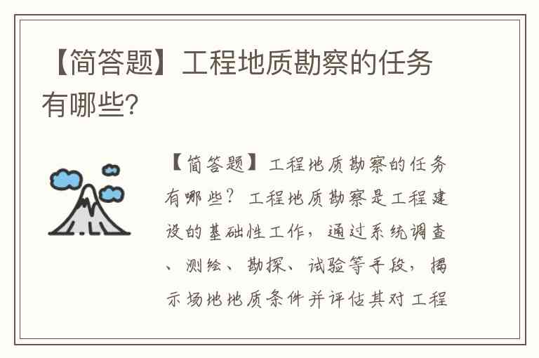 工程地质勘察是工程建设的基础性工作,通过系统调查、测绘、勘探、试验等手段,揭示场地地质条件并评估其对工程的影响。其核心任务可概括为查明条件、评价风险、提供依据三大方面,具体包括五个层次: