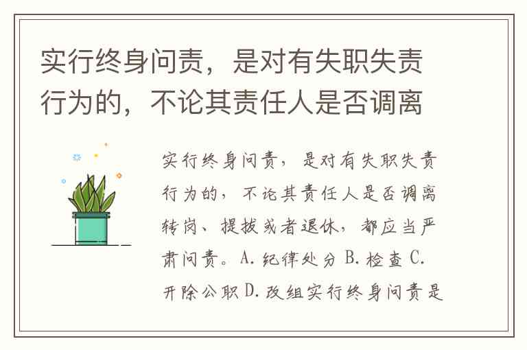 实行终身问责,是对有失职失责行为的,不论其责任人是否调离转岗、提拔或者退休,都应当严肃问责。A.纪律处分 B.检查 C.开除公职 D.改组