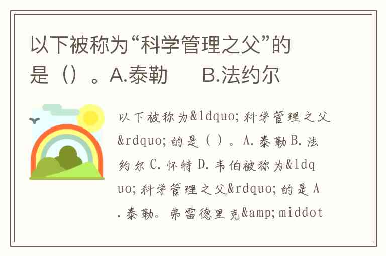 以下被称为“科学管理之父”的是()。A.泰勒 B.法约尔 C.怀特 D.韦伯