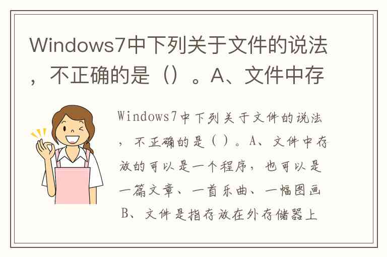 Windows7中下列关于文件的说法,不正确的是()。A、文件中存放的可以是一个程序,也可以是一篇文章、一首乐曲、一幅图画 B、文件是指存放在外存储器上的一组相关信息的集合 C、文件名由主文件名和扩展名两部分组成 D、同一个文件夹下,允许两个文件重名