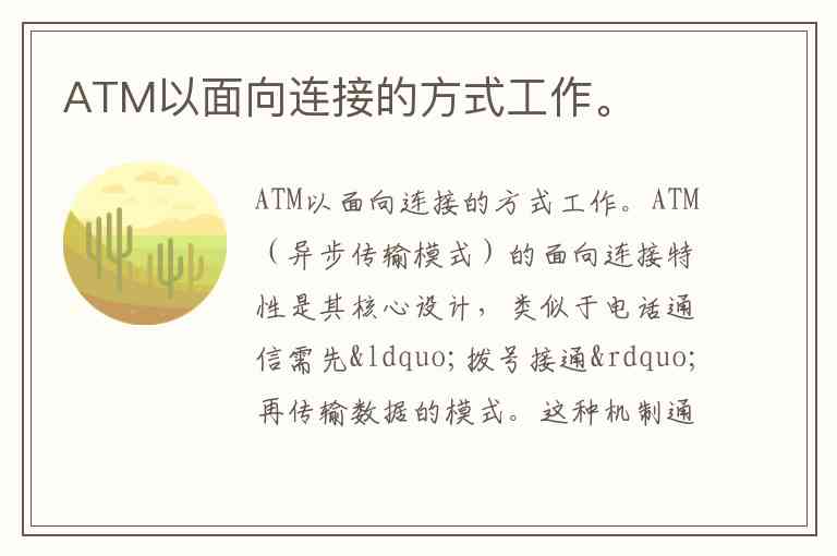 ATM(异步传输模式)的面向连接特性是其核心设计,类似于电话通信需先“拨号接通”再传输数据的模式。这种机制通过三个关键环节实现:建立连接、传输信元、释放连接,彻底改变了传统网络“盲目发送”的传输方式。