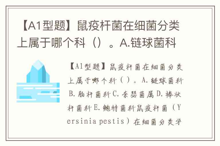 【A1型题】鼠疫杆菌在细菌分类上属于哪个科()。A.链球菌科 B.肠杆菌科 C.奈瑟菌属 D.棒状杆菌科 E.鲍特菌科